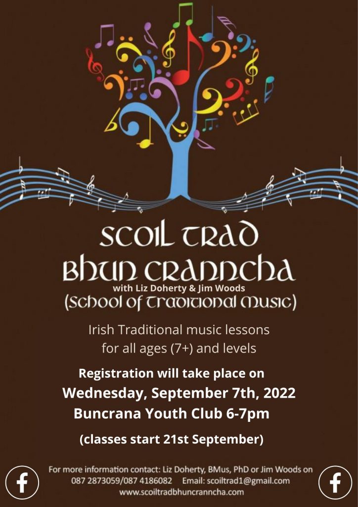 Irish Traditional Music Lessons in Buncrana with Dr. Liz Doherty & Jim Woods. Now accepting NEW STUDENTS. To register, join us on WEDNESDAY 7th September 2022, 6-7pm at the Youth Club Buncrana.